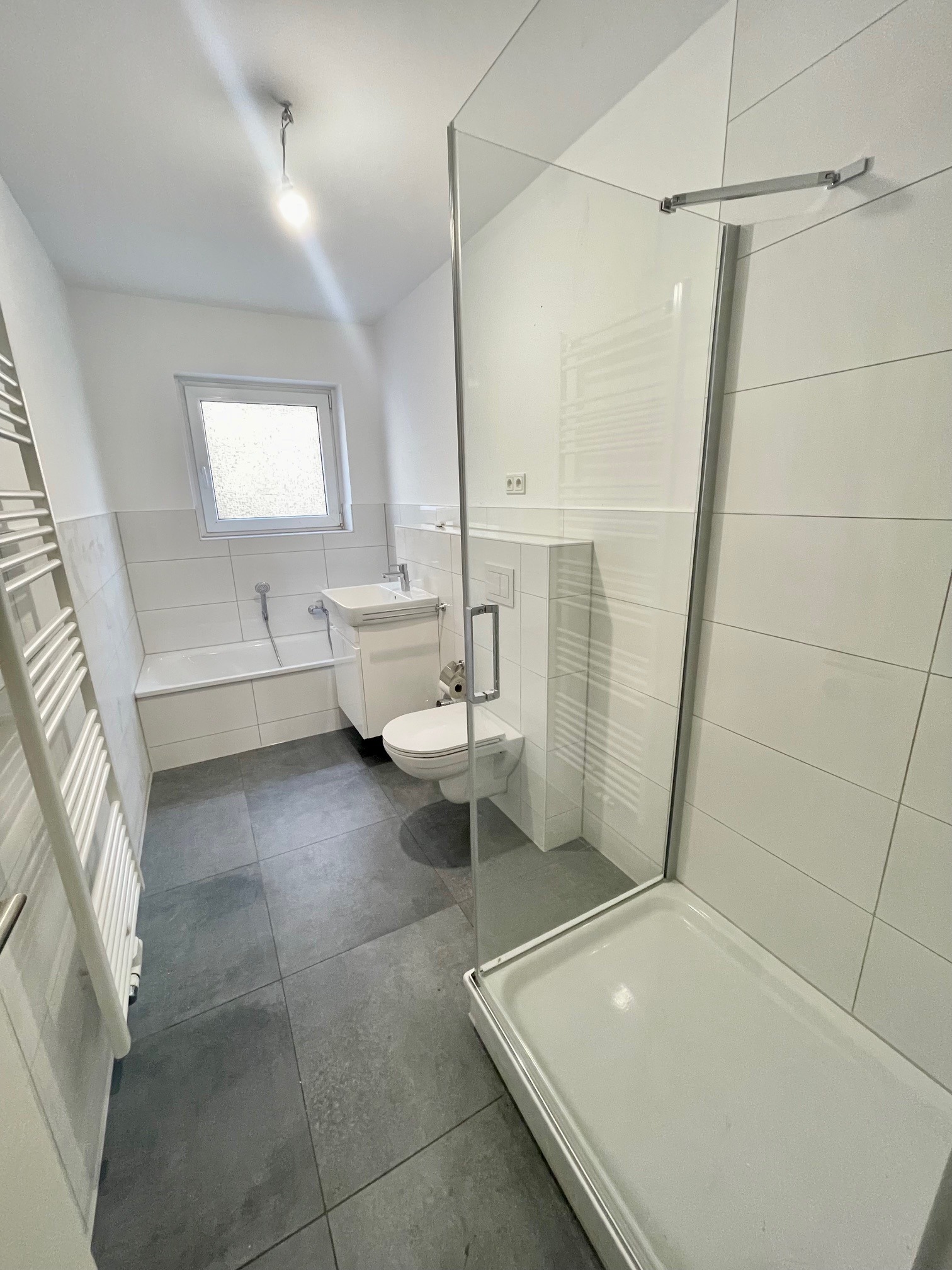 – Modernes Badezimmer mit Wanne Dusche und Fenster